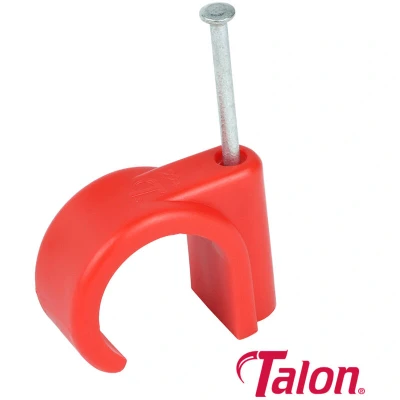General description The Talon Nail-in Clip is designed for securing 22mm pipes, made from premium grade polypropylene. It features a high-quality zinc plated hardened and tempered nail, making it suitable for all types of masonry. The clips are colored red for easy identification of hot water pipework. Technical specifications Material: Premium grade polypropylene Nail: Zinc plated hardened and tempered Pipe size: 22mm