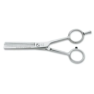 5.5-inch hair-thinning scissors. Material: stainless steel. 45-degree smooth blade. HRC54 hardness. Good blade length. Adjustable flat screw. You can gently loosen the screw using a screwdriver, without losing tension.