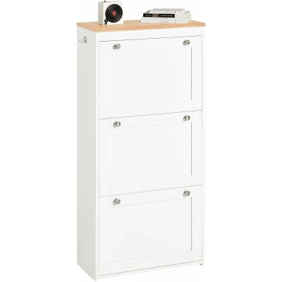 General description This modern design 3 drawers shoe cabinet perfectly matches any home decor. Ideally located in a hallway or porch, this unit offers ample storage with a shoe storage compartment featuring 3 flip-drawers, each with 2 rows of space. The top of the shoe cabinet is perfect for storing items like keys and wallets for easy access. Additionally, it includes 2 hooks on the side for hanging coats, hats, handbags, and more. The cabinet is designed for easy use with 2 handles on each drawer, allowing for smooth opening. Technical specifications Material: MDF, particle board Dimensions: W59 x D26 x H116 cm Weight: 19.5 kg Load capacity: 30 kg Installation Item comes in a flat pack and requires self-assembly Detailed instructions supplied Other information Includes an anti-tipping device for stability and safety Decorative elements are not included in the delivery