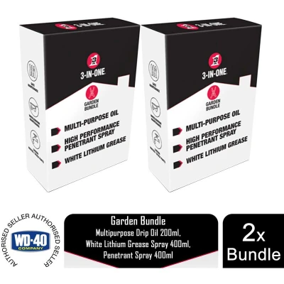 General description The 3-IN-ONE Garden Bundle includes essential products to maintain your garden equipment in excellent condition. This bundle features a Multi-Purpose Drip Oil, a White Lithium Grease, and a Penetrant Spray, all designed to clean, lubricate, and protect your tools from rust and wear. Technical specifications 3-IN-ONE Multipurpose Drip Oil: 200ml 3-IN-ONE White Lithium Grease Spray: 400ml 3-IN-ONE Penetrant Spray: 400ml Usage Use on lawnmowers, hand tools, power tools, shed locks, gates, hinges, and more. Prevents rust on garden tools and equipment. Maintains mowers and wheelbarrows. Loosens stuck and rusted parts around your garden.