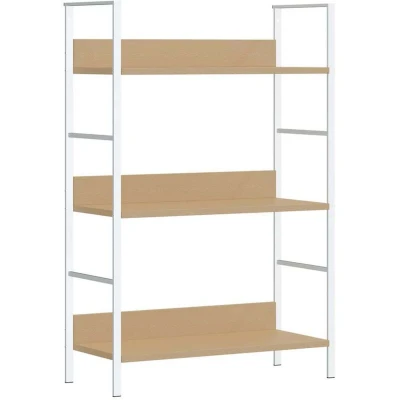 General description This 3-layer book shelf cabinet is a versatile addition to your home, suitable for use in the living room as a bookshelf or decorative display stand, or on the patio as a plant display rack. Its timeless design enhances your home decor while providing ample storage space for books, flowers, CDs, DVDs, and other decorative items. The shelf is constructed from engineered wood, making it easy to clean with a damp cloth, and features a sturdy steel structure that is anti-rust and adds an industrial style. Technical specifications Colour: Oak and white Material: Engineered wood, steel Total dimensions: 60 x 27.6 x 90.5 cm (L x W x H) Dimensions of single horizontal shelf: 56 x 27.6 x 1.5 cm (L x W x H) Dimensions of single vertical shelf: 56 x 6.8 x 1.5 cm (L x W x H) Max. load capacity (total): 45 kg Max. load capacity per shelf: 15 kg Assembly required: Yes Other information
