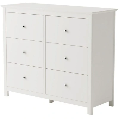 Add a touch of luxury to your bedroom with this stylish Nairn 3 plus 3 drawer double wide chest. Designed to optimise space and yet provide ample storage, there are two rows of 3 generous full width drawers which provide lots more storage for you. There is plenty of room on top for a TV, lamp or pictures and its even ideal for use as a dressing table. The really subtle deep white painted finish emphasises the soft rounded corners of the legs and top, finished off with real metal polished steel effect handles, altogether these features create a calming effect to your bedroom. Features: Luxurious white painted finish Spacious drawers with easy glide metal runners Inverted top moulding Gently rounded shaker style legs Fully finished drawer interiors Centre support panel for added stability. Real metal Convex shaped handles. Especially designed for easy home assembly. Supplied with fully detailed assembly instructions. Construction: Flat Packed Material: MDF/Particle board Number of