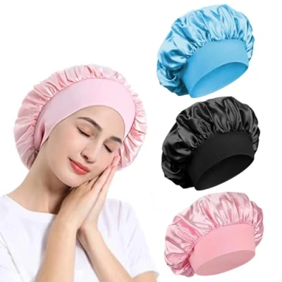 3 Pack Satin Bonnet, Night Sleep Caps with Wide Elastic Band, Silk Wrap, Soft Head Cover Sleeping Hat for Women and Girls Curly Hair (Pink,Black,Blue)