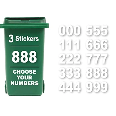 CLEARLY IDENTIFY YOUR BINS – You’ll receive a set of 3 bin numbers for wheelie bins, ensuring your bin or dustbin doesn’t get mixed up with your neighbour’s. EASY TO APPLY – No need for complicated instructions! These self-adhesive number stickers are designed to be stick on numbers for wheelie bins—just peel and apply. HIGHLY VISIBLE – At 18cm (7") tall, our bin stickers for wheelie bins ensure your bin labels stand out, preventing mix-ups on collection day. DURABLE & WEATHERPROOF – Made from high-quality adhesive numbers for wheelie bins, these wheelie bin stickers are built to withstand rain, wind, and sun for years. ORDER MULTIPLE NUMBERS – Want more than one number? Select the first number, add to basket, then repeat for the next. Your bin number stickers for wheelie bins will be made to order.
