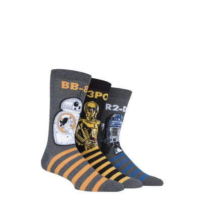 The comedy relief of the Star Wars saga, now on a triple set of soft men’s socks. Our SOCKSHOP Star Wars R2-D2, C-3PO and BB-8 Droids Cotton Socks are all woven with large, detailed full colour graphics covering the whole leg. The droids are some of the few characters that appear in all films from the original trilogy to the most recent (where BB-8 is introduced). All three pairs of these Star Wars Droids Socks in a quality cotton rich blend, so if you are seeking comfort, these ARE the Droids that you’ve been looking for!