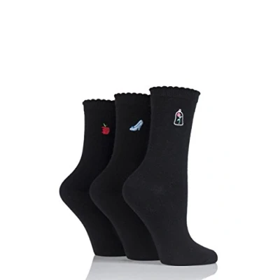 3 Pair Black Disney Princesses Embroidered Detail Cotton Socks Ladies 4 8 Film & TV Characters
