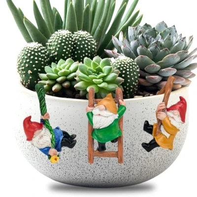 Charming Garden Gnomes Set: This set includes 3 adorable garden gnomes, each with unique poses and vibrant colors. One gnome swings on a green flower vine, another climbs a wooden ladder, and the third grips a branch, adding whimsical charm to any outdoor garden space. These 3 pack climbing gnomes tree faces decor outdoor are perfect fairy garden essentials Resin Material: Crafted from durable resin, these gnomes statues are weather - resistant, able to withstand various outdoor conditions. They maintain their vivid colors and detailed shapes for long - term garden decoration. Each gnome in the 3 - pack has distinct dimensions (e.g., the ladder - climbing one is 7.3cm tall, 3.8cm wide). Their size makes them versatile for fairy garden layouts—tuck them on mini fences, near tiny pathways, or hanging off planters Versatile Decoration: Perfect for adorning flower pots, garden fences, or tree trunks. Their compact size and easy - to - attach design (with appropriate hooks or simply placed on pot edges) make them a flexible choice to spruce up your garden, patio, or even indoor plant displays. As outdoor statues, they integrate smoothly. Mix them with mini mushrooms, tiny flowers, or other gnomes statues for a full scene, making outdoor decor fun and effortless Delightful Gift Idea: Ideal for garden lovers, DIY enthusiasts, or anyone who enjoys adding a touch of fantasy to their outdoor areas. This 3 pack of climbing gnomes is perfect for anyone into fairy garden projects or outdoor decor. It brings a cohesive and playful theme, making it a thoughtful present for housewarmings, birthdays, or holidays Enhance Garden Aesthetics: These flower pot hugger gnomes create a fairy - tale - like atmosphere in your garden. Their cute expressions and lively postures draw attention, becoming a focal point that sparks joy and invites admiration from guests, transforming ordinary garden spaces into magical little worlds, bring life to your outdoor space