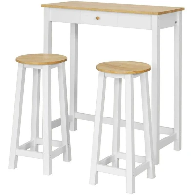 General description The SoBuy 3 PCS Kitchen Breakfast Dining Bar Set includes 1 bar table and 2 stools, making it an excellent addition to your kitchen or dining area. The set features a modern design with a beautiful beige and white wood color, perfect for various settings such as a bar, coffee shop, or casual dining space. Technical specifications Material: Rubber wood with varnished coating, MDF in white lacquer Table Dimensions: W95 x D40 x H107 cm Stool Dimensions: Top diameter: 33 cm, Height: 74 cm Weight: 27 kg Load capacity: Table: 50 kg, Stool: 90 kg Installation The item comes in a flat pack and requires self-assembly. Detailed instructions are supplied for easy installation. Usage This bar set is ideal for enjoying breakfast, casual meals, or drinks with friends. The sturdy rubber wood table surface is easy to clean, and the set is designed for stability and comfort. Other information