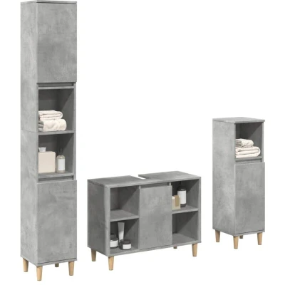 ManoManoGeneral description This stylish bathroom furniture set is an excellent addition to your bathroom, giving it a tidy and striking appearance. It is made from high-quality engineered wood, ensuring durability and resistance to moisture. Technical specifications Colour: Concrete grey Material: Engineered wood, solid eucalyptus wood Sink cabinet dimensions: 80 x 33 x 60 cm (W x D x H) Bathroom cabinet dimensions (L): 30 x 30 x 190 cm (W x D x H) Bathroom cabinet dimensions (S): 30 x 30 x 100 cm (W x D x H) Assembly required: Yes Usage Ample storage space to accommodate essential toiletries and bath items, such as soaps, shampoo, and toothpaste. The practical door helps keep your space clutter-free by hiding small essentials. The door can be assembled on the left or right side according to your preference. Easy to maintain with a smooth surface that can be cleaned with a damp cloth. Other information Screws and plugs for inside the wall are not included; use suitable screws and plugs for