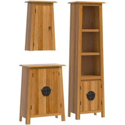 General description This bathroom furniture set is an excellent addition to your bathroom, giving it a tidy and striking appearance. Made from solid pine wood, it features a beautiful natural material with a straight grain and rustic knots, providing a unique aesthetic. Technical specifications Material: Solid pine wood Tall cabinet dimensions: 48 x 32 x 170 cm (W x D x H) Side cabinet dimensions: 59 x 32 x 80 cm (W x D x H) Wall cabinet dimensions: 42 x 23 x 70 cm (W x D x H) Assembly required: Yes Usage The bath cabinet offers ample space to accommodate essential toiletries and bath items such as soaps, shampoo, and toothpaste. The metal handles allow for easy access to the bathroom storage cabinet. The wall-mounted function maximizes floor space and keeps the area clean. Other information Warning: To prevent tipping, this product must be used with the wall attachment device (not provided). Each item is unique with variations in colors and grains, ensuring the exclusivity and