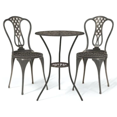 General description This 3 Piece Bistro Set in cast aluminium bronze adds a luxurious touch to any outdoor space. Perfect for enjoying a chat with friends or sipping tea, this decorative yet functional garden furniture set features a detailed floral pattern that enhances the romantic ambiance of your garden, patio, or conservatory. Technical specifications Colour: Bronze Material: Cast aluminium Table dimensions: 53 x 53 x 65 cm (L x W x H) Chair dimensions: 41 x 41 x 85 cm (W x D x H) Maximum weight capacity: 110 kg per seat Assembly required: Yes Delivery contains: 1 x Table, 2 x Chairs Usage To extend the life of your outdoor furniture, it is recommended to clean it regularly using a mild soap solution. If possible, store the set in a cool, dry place indoors. If stored outdoors, protect it with a waterproof cover. After rain or snowfall, wipe and dry excess water or snow from flat surfaces and allow sufficient air circulation to avoid moisture-related damage. Other information