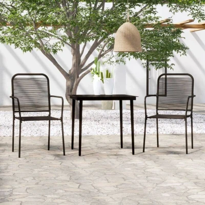 ManoManoGeneral description This trendy 3 Piece Garden Dining Set features an elegant design and clean lines, making it an excellent choice for your garden, patio, terrace, kitchen, and dining rooms. The simplistic elegance of this dining set enhances your everyday dining experience. Technical specifications Table: Colour: Black Material: Powder-coated steel, glass Dimensions: 80 x 80 x 74 cm (L x W x H) Chair: Colour: Black Material: Cotton rope, steel Dimensions: 56 x 53.5 x 85.5 cm (W x D x H) Seat width: 46 cm Seat depth: 42 cm Seat height from the ground: 43 cm Armrest height from the ground: 63.5 cm Maximum weight capacity: 110 kg per seat Assembly required: Yes Delivery contains: 1 x Table 2 x Chairs Usage To extend the life of your outdoor furniture, it is recommended to clean it regularly and avoid leaving it outdoors without protection unnecessarily. Use a mild soap solution for cleaning. If possible, store the set in a cool, dry place indoors. If stored outdoors, protect it with a