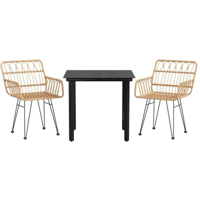 ManoManoGeneral description Create a compelling and cohesive aesthetic in your outdoor space with this 3 Piece Garden Dining Set. Made from durable PE rattan, also known as poly rattan, this set is weather resistant and easy to clean, ensuring it remains beautiful for a long time. The sturdy steel frame provides stability for daily outdoor use, while the tempered glass tabletop offers a practical and smooth surface for meals and drinks. The dining chairs are designed with backrests and armrests for added comfort. Technical specifications Table: Colour: Black Material: Powder-coated steel, tempered glass Dimensions: 80 x 80 x 74 cm (L x W x H) Chair: Material: Steel, polyethylene with a rattan look Dimensions: 56 x 64 x 80 cm (W x D x H) Seat size: 44 x 46 cm (W x D) Seat height: 47 cm Armrest height: 64 cm Maximum weight capacity: 110 kg per seat Delivery contains: 1 x Table 2 x Chair Other information Each product comes with an assembly manual in the box for easy assembly. To extend the life