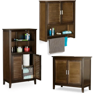General description The LAMELL bathroom cabinet set enhances your bathroom with its natural beauty and functionality. Made from sturdy bamboo, this collection is designed to withstand humid environments while providing ample storage space for cleaning products and bathroom essentials. The distinctive slatted doors add a unique visual appeal, and the dark brown finish integrates seamlessly into light-colored bathrooms. Technical specifications Washbasin cabinet dimensions (H x W x D): approx. 60 x 67 x 30 cm Washbasin cabinet weight: approx. 7.2 kg Washbasin cabinet upper shelf load capacity: max. 50 kg Washbasin cabinet inner shelf load capacity: max. 15 kg Wall cabinet dimensions (H x W x D): approx. 66 x 62 x 20 cm Wall cabinet weight: approx. 7.1 kg Wall cabinet load capacity: approx. 20 kg Wall cabinet towel rail load capacity: approx. 5 kg Wall cabinet shelf depth: 16 cm Bathroom cabinet dimensions (H x W x D): approx. 92 x 50 x 25.5 cm Bathroom cabinet weight: approx. 8.7 kg