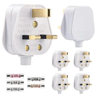 3 Pin Plug UK 13 Amp Plugs White Fused Mains with 3A 5A 7A 10A 13A Domestic Fuses Kit (6)