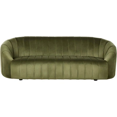 Deep Seat Velvet Sofa. Introducing our retro-inspired sofa, blending design and comfort. With a wooden frame and deep channel tufting, it exudes contemporary elegance. The low-back deep seating invites relaxation, while the soft material, in a tranquillizing shade of green, creates a cosy spot. Its sleek silhouette adds a touch of sophistication to any interior, especially well-suited for those looking for a bit of retro feel. Indulge in comfort with this chic sofa, where every detail beckons relaxation and style. Details: Product Type: 3 Seater Sofa Style: Retro General Color: Green Shade: Dark Green Material Type: Fabric Main Material: Velvet Filling Material: Foam Material Composition: 100% Polyester Arm Style: Recessed Pattern: Solid Seat Construction: Wood Seat Foam Density: 28 kg/m3 Seats Up To: 3 People Dimensions: Depth: 79 cm Seat Height: 37 cm Width: 200 cm Height: 68 cm Seating Surface: 168x57 cm Weight: 38 kg Weight Capacity per Person: 130 kg Offer Includes: 1 x Sofa Key