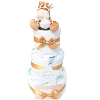 Ideal Baby Shower Gift Or Corporate Baby Gift A lovely Safari Giraffe themed 3 tier Nappy Cake contains approx 30 nappies size 3 ideal for 4-9kg baby, 1 x 100% cotton hooded baby towel 1soft plush giraffe approx 15cm ideal for little hands with a pair of socks 0-6mths 1 Let The Adventure Begin MDF plaque, 1 set of 28 Mini baby milestone cards to record all of those important baby milestones in a baby's 1st year 2 x 100% cotton baby Muslin cloths ideal as a Swaddle Blanket or burp cloths The gift is beautifully wrapped in polka dot cellophane, finished with a gift bow and gift card and sits approx 45 cm tall and looks stunning as a unique gift hamper styled nappy cake Also makes an excellent corporate Baby girl Gift set hamper style