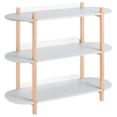 General description This minimalist 3-tier bookshelf and display shelf features a clean look and smooth lines, making it easy to integrate into various interior decorating styles. With three oval shelves, it provides ample space for books and decorative items, helping to keep your room tidy and organized. This versatile piece can be used as a side table, console table, or bookshelf, making it suitable for living rooms, waiting rooms, studies, and more. Technical specifications Material: MDF, beech wood Dimensions: W100 x D33 x H88 cm Weight: 15 kg Load capacity: 75 kg Installation Item comes in a flat pack and requires self-assembly Detailed instructions supplied Usage Can be used as a side table, console table, or bookshelf Suitable for living room, waiting room, study, etc. Other information 3 shelves made of high-quality MDF in light grey lacquer Legs made of solid beech wood for sturdiness and durability Thin metal plate at the back of each shelf prevents items from falling off 4