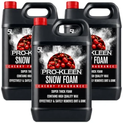 3 x 5 Litres Pro-Kleen Cherry Snow Foam with Wax The Ultimate Pre Wash containing a high amount of Wax to leave your car shining after washing Advanced formula to safely lift the toughest dirt from car body work Will also remove dirt and film from alloys, car windows and mirrors. Suitable for use on all car exteriors