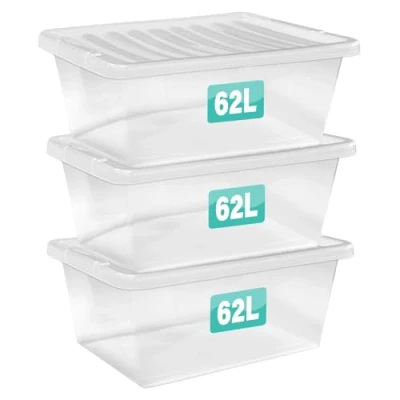 VERSATILE ORGANISATION: These Set Of 3 Boxes Ideal for any room, these storage boxes for under bed storage, or home & kitchen organisation, offer a practical way to store a variety of items, from toys to linens, ensuring your space remains tidy and organised with minimal effort. STRONG, DURABLE & BPA-FREE PLASTIC: Optimal Products Collection plastic storage boxes are proudly manufactured in Britain with premium quality polypropylene clear plastic. 100% BPA free and food safe, with no nasty smell. These clear storage boxes with lids & integrated handles provide ease of use, easier visibility & navigation MULTI-PURPOSE STORAGE FOR HOME & OFFICE: These plastic boxes with lids storage provide all round multipurpose storage solution to declutter your life. These clear plastic storage boxes are suitable for multi-purporse plastic storage containers to declutter home, office or workplace. MAXIMIZE YOUR SPACE: Our clear plastic storage box with lid (Clear) are perfect for decluttering your home, providing an efficient solution for organizing seasonal clothing, shoes, and more while keeping everything visible and accessible. HIGH GRADE & DURABLE: Our premium quality under bed storage box with lid is manufactured in Britain with polypropylene material with no nasty smells. These multipurpose sleek plastic boxes with lids storage are perfect for under bed storage. SMART DESIGN & IDEAL SIZE: The under bed box features a sleek profile that fits perfectly under most beds, allowing you to utilize otherwise wasted space while keeping your belongings safe and out of sight. Dimensions Approx: Comes as a set of 3, Each plastic box measures L65 x 49W x H28 cm, 62 litre capacity and weighs just 1.0Kg
