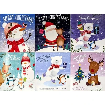 🎄 30 Mini Christmas Cards – Perfect for children to give to classmates, friends, and family during the festive season. 🎅 Includes 4 Fun Designs – Featuring cheerful Christmas characters: snowman, Santa, reindeer, polar bear, penguin and elf. 🍎 Special Cards for Teacher & Teaching Assistant – Show appreciation with two dedicated designs for classroom heroes. ✉️ White Envelopes Included – Ready to hand out, send, or pop into school bags. 📏 Compact & Cute Size – Each card measures 9.5 x 9.5 cm, ideal for little hands. 💌 Message Inside – All cards come with a pre-printed "Merry Christmas" greeting.