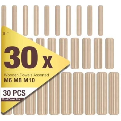 30 Pieces of Assorted Dowels: Includes M6 (6mm), M8 (8mm), and M10 (10mm) sizes to meet various woodworking needs High-Quality Hardwood: Made from durable hardwood for long-lasting strength and reliability in every project Grooved & Fluted Design: Features grooved and fluted dowels for a stronger, more secure joint in woodworking and furniture making Ideal for Multiple Applications: Perfect for furniture assembly, cabinetry, woodwork repairs, and crafting Versatile & Multi-Purpose: Suitable for both professional woodworkers and DIY enthusiasts working on various wood projects