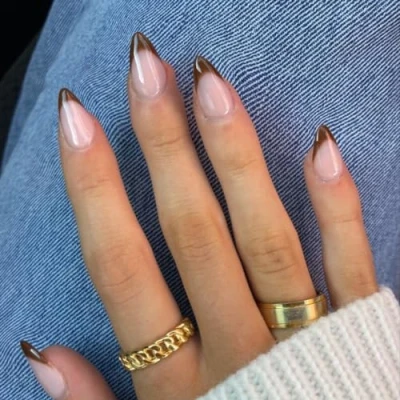 30 Pcs Brown French Tip Press on Nails Short Almond ons, Fake Shaped Acrylic Christmas Natural Glue False for Women 15 Sizes