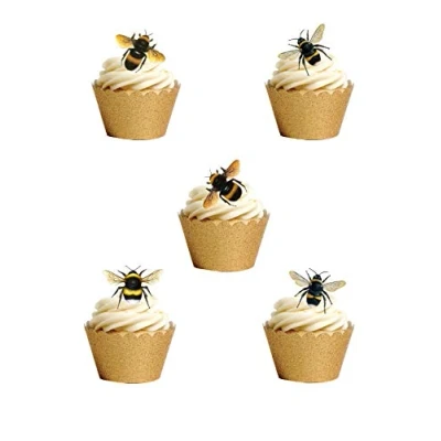 30 stand up Edible Bee Themed Wafer Paper Cupcake toppers You will receive 30 Bee image toppers exactly as shown in the photos Really great animal themed edible cake toppers - perfect for children's parties These toppers require cutting out with sharp scissors and then just push them into icing and they will stand up. Fully edible, printed on thick quality wafer paper with edible inks - Wafer Paper Ingredients=Water, Olive. Oil & Potato Starch