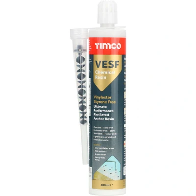 General description Vinylester styrene free low odour resin is a high performance, rapid curing, two component, mix in the nozzle resin with European approval. It is suitable for many kinds of solid and hollow masonry and is simple to apply by pumping a required resin quantity into the designated area. Technical specifications Volume: 300ml Type: Vinylester styrene free Curing: Rapid Application: Two component, mix in the nozzle