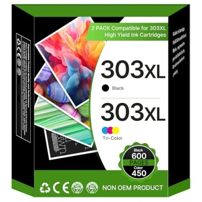 303XL Ink Cartridges for HP303 for HP 303XL Black and Colour Ink Cartridge Replacement for HP 303 Ink Cartridges Combo Pack 303 XL (Not Original,1 Black and 1 Tri-Colour)303 303XL Excellent print quality,Bringing you efficient and exquisite printing effects 303XL Ink Cartridges Black and Colour Compatible Printer Compatible With HP Envy Photo:6220 6230 6232 6234 7120 7130 7132 7134 7137 7820 7830 7832;Compatible for Tango:TangoX Page Yield:600 pages per 303 black ink cartridge XL, 450 pages per 303 colour ink cartridge XL (A4 at 5% coverage) Package Contents:1 x 303XL Black Ink Cartridges, 1 x 303XL Colour Ink Cartridges(303xl ink cartridges multipack for HP 303 ink cartridges black and colour, Pack of 2 , packaging may vary) Our 303 XL Ink Cartridge Replacement for HP 303 Ink Cartridges undergoes rigorous testing before shipping to ensure you outstanding print quality and reliable performance; Dedicated technical support is available to you at any time