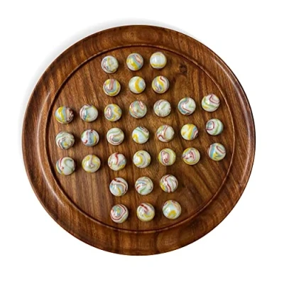 Carefully carved from Shesham wood, this BEAUTIFULLY CRAFTED SOLITAIRE SET IS A JOY TO PLAY. When set on a coffee table this game will keep idle hands occupied and minds tested. This beautifully crafted Solitaire Game Set comes complete with a set of 32 GLASS Pan American WHITE MARBLES WITH MULTI COLOURED SWIRLS (plus 1 spare) which sit upon a circular board of dark wood to create a stunning contrast between the pieces, the grooved perimeter allows the spare marbles to stay close at hand. Equally entertaining for a casual player and anybody who wants to learn the advanced intricacies of the game, an engaging and challenging game come up with effective strategies to clear your puzzle board and win the game. Remove as many marbles as you can by jumping one piece over another. The board measures 30CM IN DIAMETER WITH A DEPTH OF 2.5CM | 12 inches diameter with a depth of 1 inch, the marbles are 22mm in diameter | 0.85 inches in diameter, Great for individual play and an ideal way to develop the strategic mind from an early age. The boards have been crafted from sheesham wood, a HARDWOOD with a rich, fine grain, it is a SUSTAINABLE ALTERNATIVE to traditional hardwoods such as teak and mahogany., Manufacturer: Thorness
