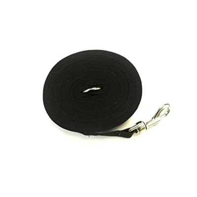 30ft 9m Long Dog Training Lead In Black. High quality and lightweight 25mm polypropylene webbing. The width of this dog training lead is 2.5cm. Our dog lead has a nickel plated o-ring in the handle so it can be adjusted to half the length if required. Great for small, medium and large dogs. Ideal for training, outdoor play, camping, backyard, beach, walking, running and recall training. Made in the UK by Church Products UK