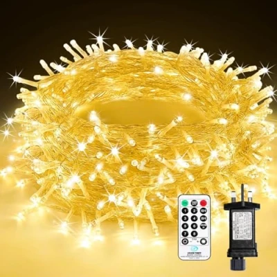 【Christmas Lights Indoor】30M Christmas lights are equipped with a 5m extension cord and 300 warm white LEDs, perfect for indoor and outdoor decoration. The fairy lights with plugs improve the stability of the lamp brightness while reducing energy consumption by up to 90%! 【8 Modes & Memory Function】Combination, In waves, Sequential, Slow Glow, Chasing/Flash, Slow Fade, Twinkle/Flash and Steady On, different modes are controlled by the remote control or the button on the plug, the outdoor christmas lights have a built-in memory chip, automatically remembering the last set mode, no need to re-set. 【Expandable & Timer】Up to 3 outside christmas lights can be connected to meet the needs of various venue decorations to the greatest extent. The fairy lights for bedroom have 3 timing functions and 4 brightness levels, which you can easily adjust according to your mood. 【Safety & Waterproof】31V low voltage plug and low-temperature outdoor fairy lights are safe to touch even after long-term use, ensuring and maximizing safety. The xmas tree lights is IP65 waterproof, perfect for outdoor decoration, and low consumption. Note: Please keep the adapter away from water. 【Perfect Christmas Decorations】The warm white christmas fairy lights adopt transparent cables, which can be easily wrapped around Christmas trees, stairs, gazebos, trees, roofs, porches, etc., which are very suitable for decorating gardens, Christmas, parties, weddings, Halloween, holiday decorations.