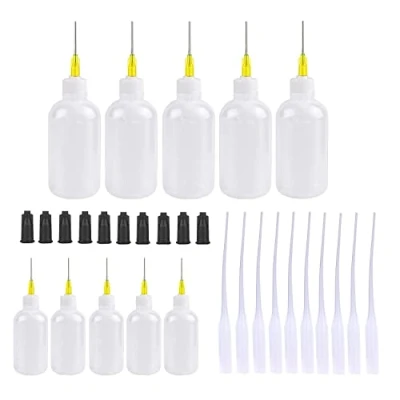 【Material】- These applicator bottles are made of translucent soft flexible plastic, easy to squeeze, non-toxic and odorless. 【Feature】- These applicator bottles are small size and light weight, and can be carried around after fixing the tip cap. Resuable, easy to use and squeeze, washable. The syringe caps can well prevent the liquid from drying out or leaking. Great for lab dispensing and other projects that require small drops or fine lines of glue. 【Excellent Precision Tool】- Needles and plastic bottles can be freely removed - loaded. The nib is very delicate and accurately control the volume that press out. The multi-colored tips help you distinguish different glues and liquids. 【Multiple Function】- These dispensing bottle, for Wood Glue, Glues, Adhesives, Light Oil, Great tools set for essential oil, science lab, flat back rhinestones, hobby crafts, home or industrial precison applications of glues, inks, perfume, lubricants, sealants, children making DIY handcraft and painting etc. 【Package Included】- 5pcs 30ml applicator bottles; 5pcs 50ml applicator bottles; 10pcs Black Syringe caps and 10pcs Glue Nozzles. Total 30pcs.