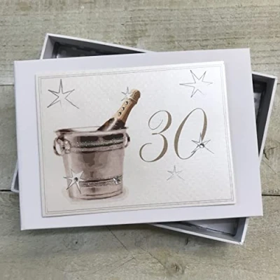 Beautiful handmade 30th Birthday Champagne Bucket photo album Presented in a white gift box with a clear perspex lid Includes 16 pockets to hold up to 32 photos Hand finished with gorgeous diamantes and sparkling glitter The perfect gift for your special occasion