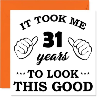 MAKE THEM SMILE WITH THIS UNIQUE BIRTHDAY CARD: This exceptional quality birthday card for him or her shows the design 'It Took Me 31 Years To Look This Good'. If you are looking for special birthday greetings cards for Men birthday card then then this happy birthday card is bound to make them smile. Not just for birthday gifts for Men this could also be for Wife, Brother, Son, Uncle, Colleague, Husband, Niece or Nephew. WHAT DO YOU GET: The cards are printed on both sides with the inside print saying '0' and ample space for your own personal message. The unique fun design is printed on a specially sourced and environmentally responsible board. At 360 microns thick the natural white one-sided gloss board has a quality look and feel. Supplied with a coloured gummed envelope to complement the design and ready to be sealed and sent in the post. NO INK SMUDGES: There is nothing worse than writing inside a card to find that the shiny surface makes the ink smudge. This is why we use a high quality one sided coated board. The uncoated side will absorb more of the ink from your pen to make smudging a thing of the past. 31st Birthday card for Son, 31st Birthday card for Uncle, 31st Birthday card for Colleague. SIZES: Greeting Card = 145mm x 145mm, Envelope = 155mm x 155mm, Card Thickness = 360 micron. Husband 31st birthday card, birthday cards for Niece, special birthday cards for Nephew, 31st birthday card Wife, Brother 31st birthday card. MADE AND QUALITY CHECKED IN THE UK: We print and manufacture all our products right here in the UK so you can be sure of a fast turnaround and a product that is expertly made. Using environmentally responsible premium board our card is conscious of the responsible management of the world's forests - perfect birthday cards for Men, fun birthday cards for him, Brother 31st birthday cards, female birthday cards.