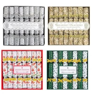 General description The cutest little addition to your Christmas table with our miniature crackers. Small enough to fit on your saucer, they can be placed right next to your brew. These crackers are a great alternative to larger ones that can often overpower the table decorations. Featuring a traditional festive print and colors, the design includes Christmas poinsettia and a stag with winter greenery. Make this year's Christmas period extra special with these stunning saucer crackers. Technical specifications Each pack contains 8 saucer crackers. Dimensions of each cracker: approximately 11.5 cm x 1.5 cm. Usage Each cracker contains a joke or a trivia question, adding fun to your Christmas celebrations.