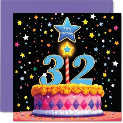 32nd Birthday Cards for Men Women Pink Cake & Stars Happy Card 32 Year Old Man Woman Son Auntie Niece Wife, 145mm Bday Greeting