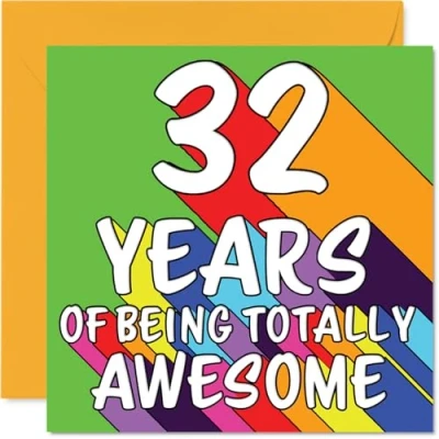 MAKE THEM SMILE WITH THIS UNIQUE BIRTHDAY CARD: This exceptional quality birthday card for him or her shows the design '32 YEARS OF BEING TOTALLY AWESOME'. If you are looking for special birthday greetings cards for Men birthday card then then this happy birthday card is bound to make them smile. Not just for birthday gifts for Men this could also be for Friend, Colleague, Wife, Brother, Cousin, Neighbour, Nephew or Husband. WHAT DO YOU GET: The card is printed on one side and BLANK ON THE INSIDE to allow you to write your very own message. The unique fun design is printed on a specially sourced and environmentally responsible board. At 360 microns thick the natural white one-sided gloss board has a quality look and feel. Supplied with a coloured gummed envelope to complement the design and ready to be sealed and sent in the post. Great Friend birthday cards, Colleague birthday card. DESIGNED FOR WRITING: There is nothing worse than writing inside a card to find that the shiny surface makes the ink smudge. This is why we use a high quality one sided coated board. The uncoated side will absorb more of the ink from your pen to make smudging a thing of the past. 32nd Birthday card for Wife, 32nd Birthday card for Brother, 32nd Birthday card for Cousin. SIZES: Greeting Card = 145mm x 145mm, Envelope = 155mm x 155mm, Card Thickness = 360 micron. Neighbour 32nd birthday card, birthday cards for Nephew, special birthday cards for Husband, 32nd birthday card Friend, Colleague 32nd birthday card. MADE AND QUALITY CHECKED IN THE UK: We print and manufacture all our products right here in the UK so you can be sure of a fast turnaround and a product that is expertly made. Using environmentally responsible premium board our card is conscious of the responsible management of the world's forests - perfect birthday cards for Men, fun birthday cards for him, Colleague 32nd birthday cards, female birthday cards.