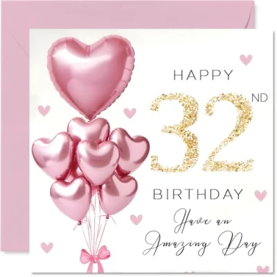 32nd Birthday Cards for Women Pink Glitter Balloons Happy Card 32 Year Old Woman Niece Neighbour Wife Auntie, 145mm Bday Greeting