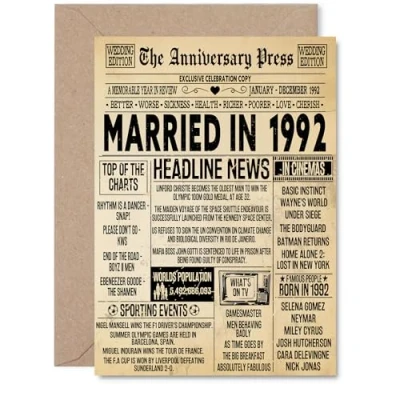 33rd Anniversary Card for Men Women Vintage Newspaper Married in 1992 Happy 33 Year Wedding Husband Partner Wife Companion, A5 Anniversaries Greeting Cards
