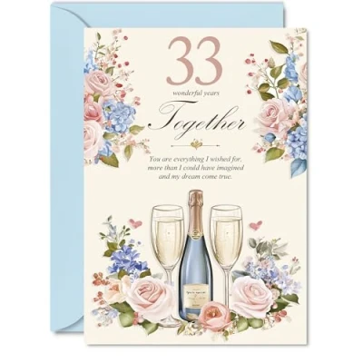 33rd Anniversary Card for Women Men Floral Champagne Happy 33 Year Boyfriend Companion Wife Partner, A5 Wedding Anniversaries Greeting Cards