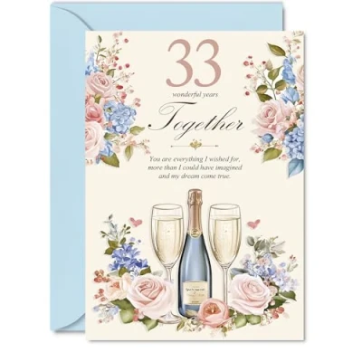 33rd Anniversary Card for Women Men Floral Champagne Happy 33 Year Partner Wife Girlfriend Companion, 5x7 Inch Wedding Anniversaries Greeting Cards