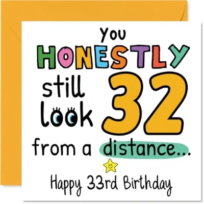 MAKE THEM SMILE WITH THIS UNIQUE BIRTHDAY CARD: This exceptional quality birthday card for him or her shows the design 'You Honestly still look 32 from a distance Happy 33rd Birthday'. If you are looking for special birthday greetings cards for Men birthday card then then this happy birthday card is bound to make them smile. Not just for birthday gifts for Men this could also be for Colleague, Nephew, Neighbour, Uncle, Cousin, Sister, Son or Friend. WHAT DO YOU GET: The card is printed on one side and BLANK ON THE INSIDE to allow you to write your very own message. The unique fun design is printed on a specially sourced and environmentally responsible board. At 360 microns thick the natural white one-sided gloss board has a quality look and feel. Supplied with a coloured gummed envelope to complement the design and ready to be sealed and sent in the post. Great Colleague birthday cards, Nephew birthday card. NO INK SMUDGES: There is nothing worse than writing inside a card to find that the shiny surface makes the ink smudge. This is why we use a high quality one sided coated board. The uncoated side will absorb more of the ink from your pen to make smudging a thing of the past. 33rd Birthday card for Neighbour, 33rd Birthday card for Uncle, 33rd Birthday card for Cousin. SIZES: Greeting Card = 145mm x 145mm, Envelope = 155mm x 155mm, Card Thickness = 360 micron. Sister 33rd birthday card, birthday cards for Son, special birthday cards for Friend, 33rd birthday card Colleague, Nephew 33rd birthday card. MADE AND QUALITY CHECKED IN THE UK: We print and manufacture all our products right here in the UK so you can be sure of a fast turnaround and a product that is expertly made. Using environmentally responsible premium board our card is conscious of the responsible management of the world's forests - perfect birthday cards for Men, fun birthday cards for him, Nephew 33rd birthday cards, female birthday cards.