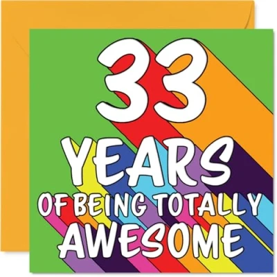 MAKE THEM SMILE WITH THIS UNIQUE BIRTHDAY CARD: This exceptional quality birthday card for him or her shows the design '33 YEARS OF BEING TOTALLY AWESOME'. If you are looking for special birthday greetings cards for Men birthday card then then this happy birthday card is bound to make them smile. Not just for birthday gifts for Men this could also be for Colleague, Wife, Brother, Cousin, Neighbour, Nephew, Husband or Son. WHAT DO YOU GET: The card is printed on one side and BLANK ON THE INSIDE to allow you to write your very own message. The unique fun design is printed on a specially sourced and environmentally responsible board. At 360 microns thick the natural white one-sided gloss board has a quality look and feel. Supplied with a coloured gummed envelope to complement the design and ready to be sealed and sent in the post. Great Colleague birthday cards, Wife birthday card. DESIGNED FOR WRITING: There is nothing worse than writing inside a card to find that the shiny surface makes the ink smudge. This is why we use a high quality one sided coated board. The uncoated side will absorb more of the ink from your pen to make smudging a thing of the past. 33rd Birthday card for Brother, 33rd Birthday card for Cousin, 33rd Birthday card for Neighbour. SIZES: Greeting Card = 145mm x 145mm, Envelope = 155mm x 155mm, Card Thickness = 360 micron. Nephew 33rd birthday card, birthday cards for Husband, special birthday cards for Son, 33rd birthday card Colleague, Wife 33rd birthday card. MADE AND QUALITY CHECKED IN THE UK: We print and manufacture all our products right here in the UK so you can be sure of a fast turnaround and a product that is expertly made. Using environmentally responsible premium board our card is conscious of the responsible management of the world's forests - perfect birthday cards for Men, fun birthday cards for him, Wife 33rd birthday cards, female birthday cards.