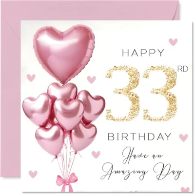 33rd Birthday Cards for Women Pink Glitter Balloons Happy Card 33 Year Old Woman Neighbour Cousin Niece Wife, 145mm Bday Greeting