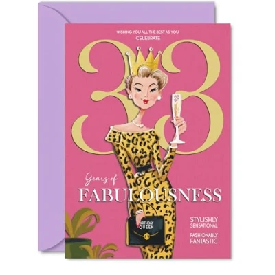 MAKE HER SMILE WITH THIS UNIQUE BIRTHDAY CARD: This exceptional quality birthday card for her shows the design 'Wishing you all the best as you celebrate 33 years of fabulousness'. If you are looking for special birthday greetings cards for Women birthday card then then this happy birthday card is bound to make her smile. Not just for birthday gifts for Women this could also be for Colleague, Auntie, Friend, Cousin, Niece, Daughter, Wife or Neighbour. WHAT DO YOU GET: The cards are printed on both sides with the inside print saying 'Have a Luminously Lovely Day' and ample space for your own personal message. The unique design is printed on a specially sourced and environmentally responsible board. At 360 microns thick the natural white one-sided gloss board has a quality look and feel. Supplied with a coloured gummed envelope to complement the design and ready to be sealed and sent in the post. NO INK SMUDGES: There is nothing worse than writing inside a card to find that the shiny surface makes the ink smudge. This is why we use a high quality one sided coated board. The uncoated side will absorb more of the ink from your pen to make smudging a thing of the past. 33rd Birthday card for Friend, 33rd Birthday card for Cousin, 33rd Birthday card for Niece. SIZES: Greeting Card = 127mm x 178mm, Envelope = 130mm x 180mm, Card Thickness = 360 micron. Daughter 33rd birthday card, birthday cards for Wife, cute birthday cards for Neighbour, 33rd birthday card Colleague, Auntie 33rd birthday card. MADE AND QUALITY CHECKED IN THE UK: We print and manufacture all our products right here in the UK so you can be sure of a fast turnaround and a product that is expertly made. Using environmentally responsible premium board our card is conscious of the responsible management of the world's forests - perfect birthday cards for Women, fun birthday cards for her, Auntie 33rd birthday cards, female birthday cards.