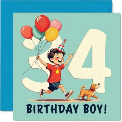 34th Birthday Cards for Men Balloon Boy Happy Card 34 Year Old Man Nephew Husband Colleague Neighbour, 145mm Bday Greeting