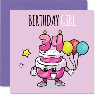 34th Birthday Cards for Women Cake Girl Balloons Happy Card 34 Year Old Woman Auntie Colleague Cousin Neighbour, 145mm Bday Greeting