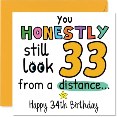 MAKE THEM SMILE WITH THIS UNIQUE BIRTHDAY CARD: This exceptional quality birthday card for him or her shows the design 'You Honestly still look 33 from a distance Happy 34th Birthday'. If you are looking for special birthday greetings cards for Men birthday card then then this happy birthday card is bound to make them smile. Not just for birthday gifts for Men this could also be for Nephew, Neighbour, Uncle, Cousin, Sister, Son, Friend or Auntie. WHAT DO YOU GET: The card is printed on one side and BLANK ON THE INSIDE to allow you to write your very own message. The unique fun design is printed on a specially sourced and environmentally responsible board. At 360 microns thick the natural white one-sided gloss board has a quality look and feel. Supplied with a coloured gummed envelope to complement the design and ready to be sealed and sent in the post. Great Nephew birthday cards, Neighbour birthday card. NO INK SMUDGES: There is nothing worse than writing inside a card to find that the shiny surface makes the ink smudge. This is why we use a high quality one sided coated board. The uncoated side will absorb more of the ink from your pen to make smudging a thing of the past. 34th Birthday card for Uncle, 34th Birthday card for Cousin, 34th Birthday card for Sister. SIZES: Greeting Card = 145mm x 145mm, Envelope = 155mm x 155mm, Card Thickness = 360 micron. Son 34th birthday card, birthday cards for Friend, special birthday cards for Auntie, 34th birthday card Nephew, Neighbour 34th birthday card. MADE AND QUALITY CHECKED IN THE UK: We print and manufacture all our products right here in the UK so you can be sure of a fast turnaround and a product that is expertly made. Using environmentally responsible premium board our card is conscious of the responsible management of the world's forests - perfect birthday cards for Men, fun birthday cards for him, Neighbour 34th birthday cards, female birthday cards.